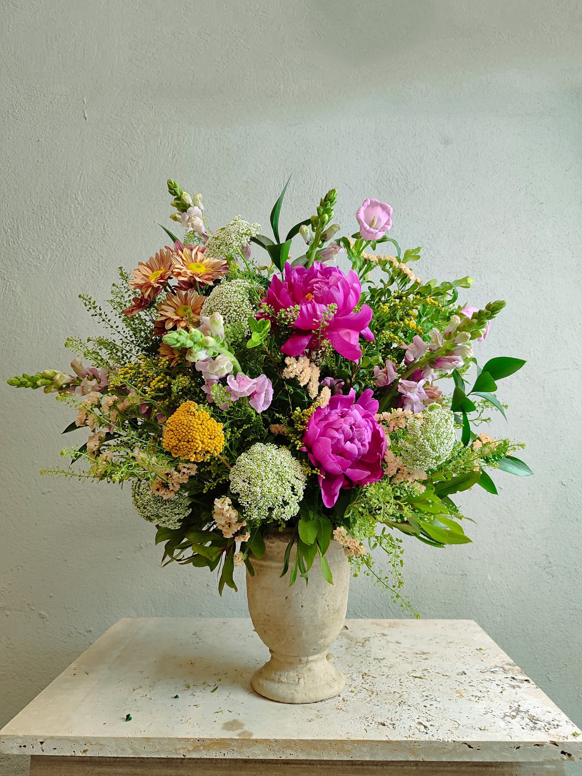 Copa de piedra con flores de temporada. Puedes elegir los tonos que más te gusten y la fecha de entrega de tu arreglo.